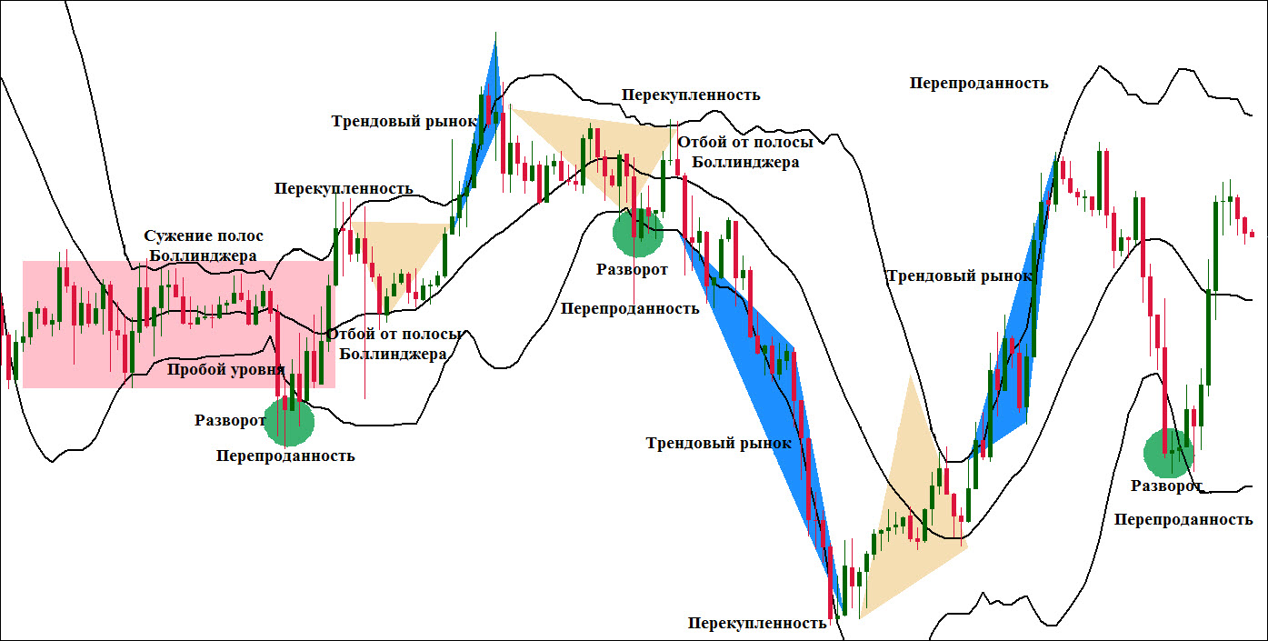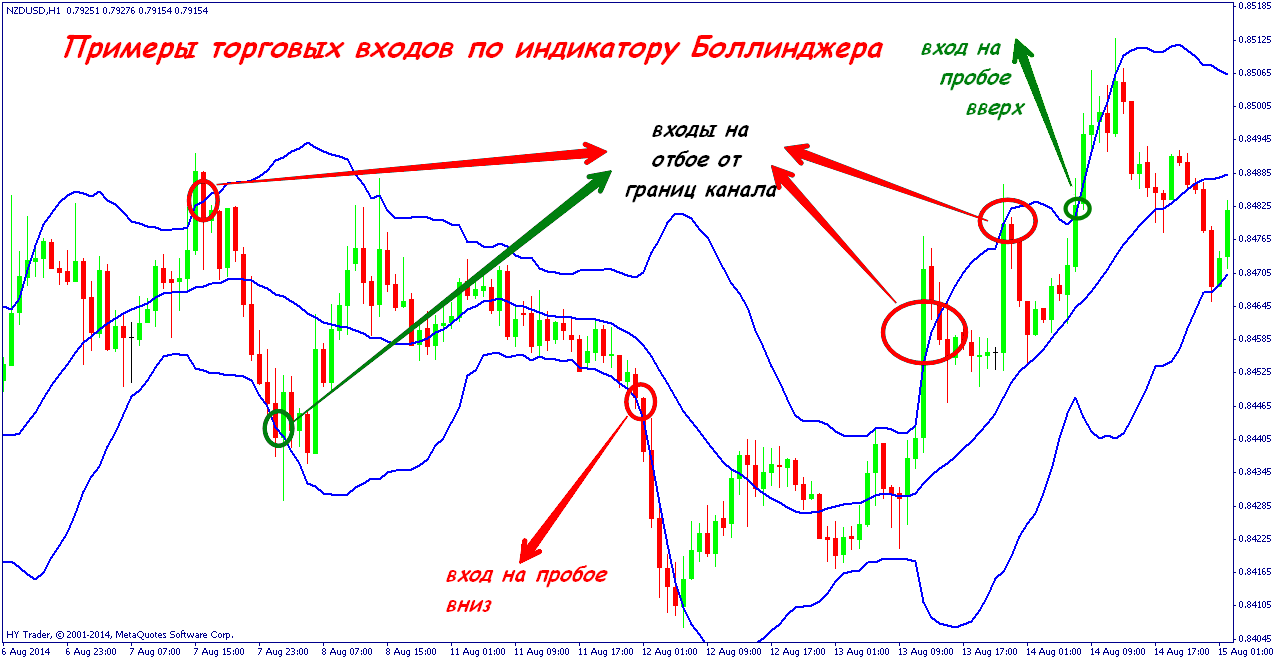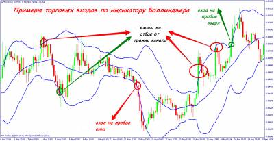 В этой статье мы разберем один очень известный индикатор, который получил свое название в честь его создателя, и называется он — индикатор Боллинджера. Индикатор Боллинджера, относится к трендовым индикаторам и представляет собой одну из разновидностей динамического диапазона. Суть работы и интерпретация индикатора Боллинджера: Индикатор полосы Боллинджера по своей сути схожи с конвертами скользящих средних. Однако есть одно отличие и заключается оно в том, что границы полос Боллинджера выстраиваются на расстоянии, равному определенному количеству стандартных отклонений. В свою очередь, границы конвертов располагаются ниже и выше от кривой скользящей средней на фиксированном (в процентном выражении) расстоянии. Использование стандартных отклонений для расчета линий привело к тому, что ширина канала образуемого индикатором полосы Боллинджера изменяется с учетом текущей волатильности: линии автоматически расширяются при росте волатильности и сужаются при ее падении. Применение индикатора полосы БоллинджераПолосы Боллинджера применяют как для определения разворотов движения, так и для входов по тренду. Роль тренда отведена центральной линии скользящей средней, роль уровней поддержки и сопротивления отведена полосам, пробитие которых может продолжить движение тренда в этом направлении. Когда цена пробивает уровень сопротивления (или верхнюю линию) снизу вверх и свеча закрывается выше данного уровня, это может служить сигналом на покупку. Когда цена пересекает нижнюю полосу сверху вниз и закрывается ниже данного уровня поддержки, это свидетельствует о том, что цена может продолжить свое нижне направленное движение, и соответственно дает сигнал для входа в короткую позицию, то есть продажу. Ниже на рисунке представлены примеры входов. | |