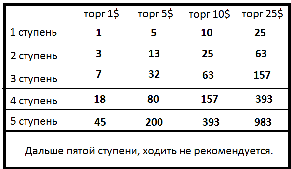 Многие задумывались, обладают ли бинарные опционы возможностью гарантировать стопроцентный выигрыш? Существует ли беспроигрышная стратегия или система, которая бы позволяла получить прибыль без всякого риска? Ответ на вышестоящие вопросы однозначный – такого метода не существует. Любая стратегия имеет свои положительные и отрицательные стороны и не может применяться одинаково успешно ко всем видам бинарных опционов. Однако есть одна стратегия, благодаря которой можно существенно снизить риск проигрыша и с большой долей вероятности отыграть начальную инвестицию. Это стратегия Мартингейл для бинарных опционов. Метод Мартингейла в бинарных опционах применяется очень многими трейдерами, ведь он позволяет за несколько последовательных шагов максимально возможно увеличить математические шансы на то, что инвестиция окажется в прибыли. Стратегия Мартингейл в торговле на бинарные опционы применяется в случае, если максимальная сумма инвестиции не ограничена или хотя бы позволяет провести пять первых шагов стратегии. Суть системы Мартингейл в бинарных опционах. Суть системы Мартингейл очень проста. Она заключается в том, чтобы при каждом проигрышном опционе удваивать свои инвестицию для того, чтобы в следующем опционе в случае выигрыша вернуть прошлые потери и еще заработать. Если опцион выигрышный, то ничего удваивать не нужно, нужно покупать следующий опцион. Вроде бы все просто и понятно и зная эту стратегию можно смело браться за дело, даже не разбираясь в финансовых рынках, активах и прочей не нужной ерунде: просто делай ставку и если проиграл, ставь в 2 раза больше. Но давайте посмотрим, какой же нужен депозит для этой стратегии. Например, если мы начинаем сделки с 1 доллара, то можно легко построить наши шаги в случае неудачи: 1,2,4,8,16,32,64,128,256,512 , мы видим, что начиная со сделки в 1 доллар нам нужно 927 долларов, чтобы выдержать серию из 10 проигрышных опционов, т.е. наша сумма в 927 раз больше первоначальной инвестиции. Но кто сказал, что рано или поздно не наступит момент, когда и 10 опцион будет проигрышным и нам придется достать из карманов еще 1024 доллара и это не предел. Давайте разберем несколько примеров, как используют метод мартингейл на Бинарных опционах: Увеличивая ставку в геометрической прогрессии, вы увеличиваете свои шансы вернуть проигранные деньги в случае выигрыша. Однако ваш депозит должен быть готов к этим увеличением. Но если бы все было так гладко, то в нашей стране никто бы не работал, а только кликал мышкой. Для начала хочу напомнить, что бинарные опционы это, прежде всего рынок. Упрощенный, но все-таки рынок. И в нем присутствуют свои закономерности. Поэтому необходимо проводить анализ каждого лота и тщательно следить за ним, чтобы сделать ставку. Только рациональный подход и разум позволят вам получить прибыль. В целом, можно сказать, что математические ожидание хоть и сводиться к 99% на получение прибыли, но есть 1% на то, что система не сработает. Такова математика, и от нее никуда не деться. Но все равно, некоторые умудряются получать стабильную прибыль, торгуя с помощью метода мартингейл. Здесь можно сказать лишь одно, что Мартингейл это разновидность стратегий, это как отдельная стратегия, как и все другие. Поэтому, даже торгуя по стратегии Мартингейл нужен опыт и четкие правила, как собственно я для тор